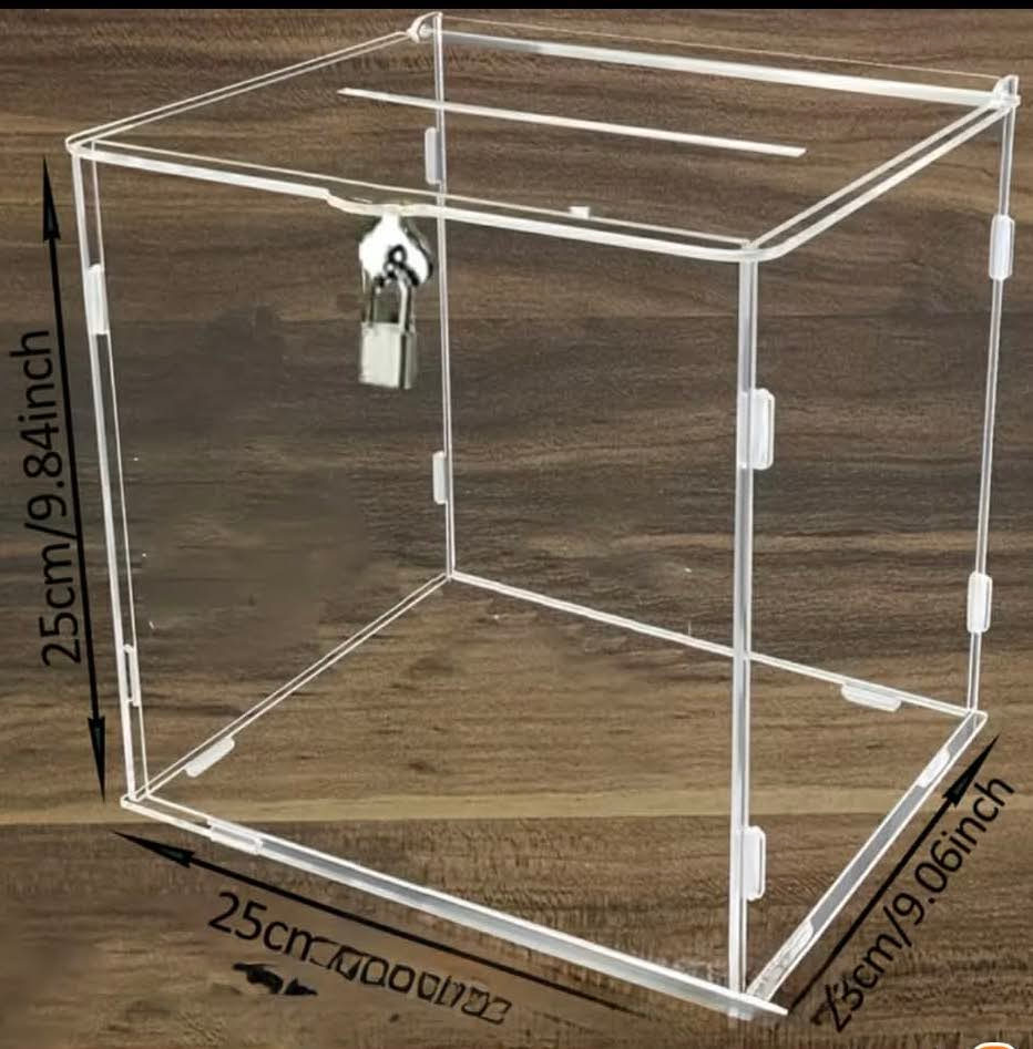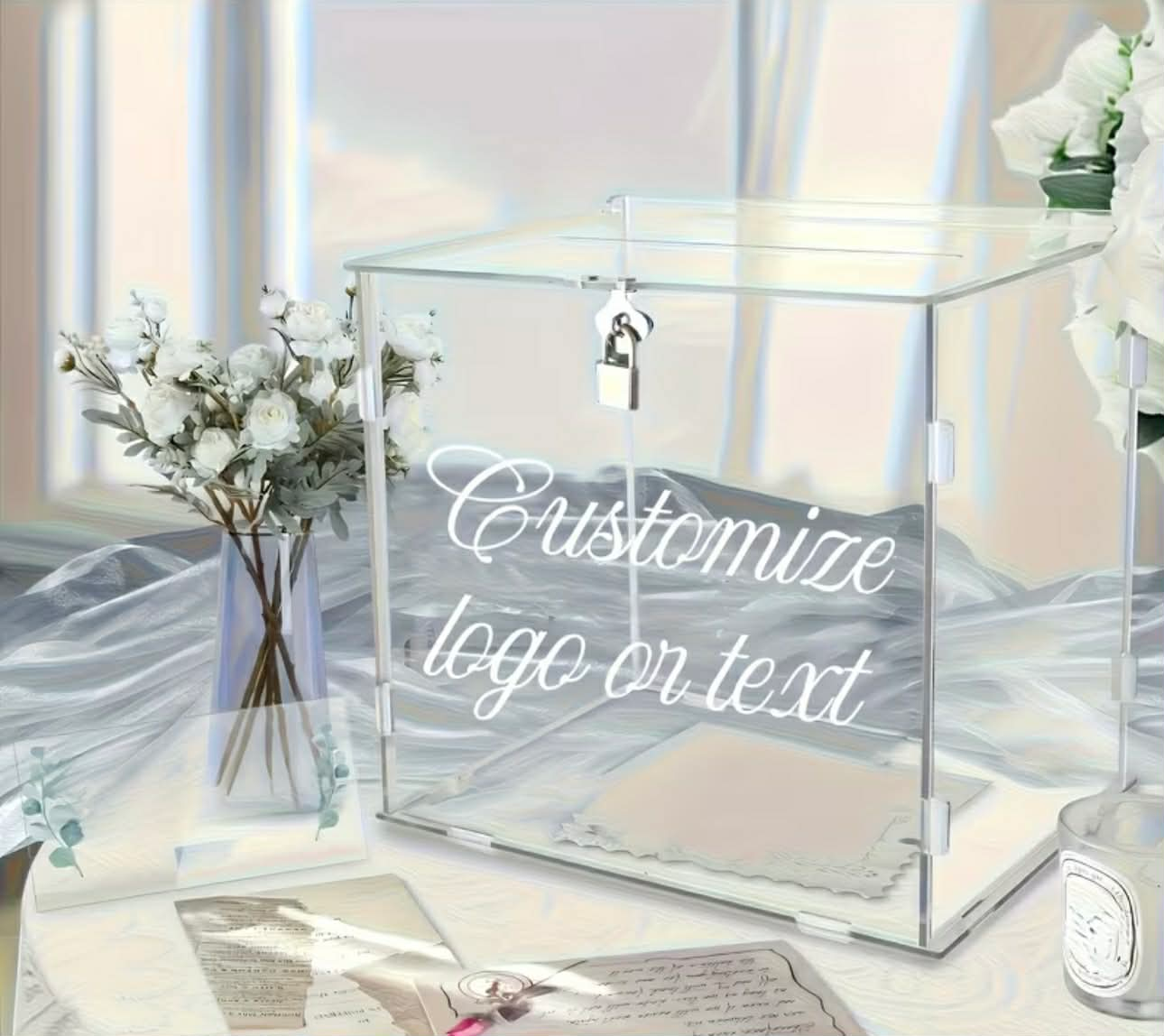 Overflaten kan ha egen skrift, datoer og navn. Kan også brukes som sparebossen, brev innsamling, etc. Størrelse: L cm x H cm x B cm