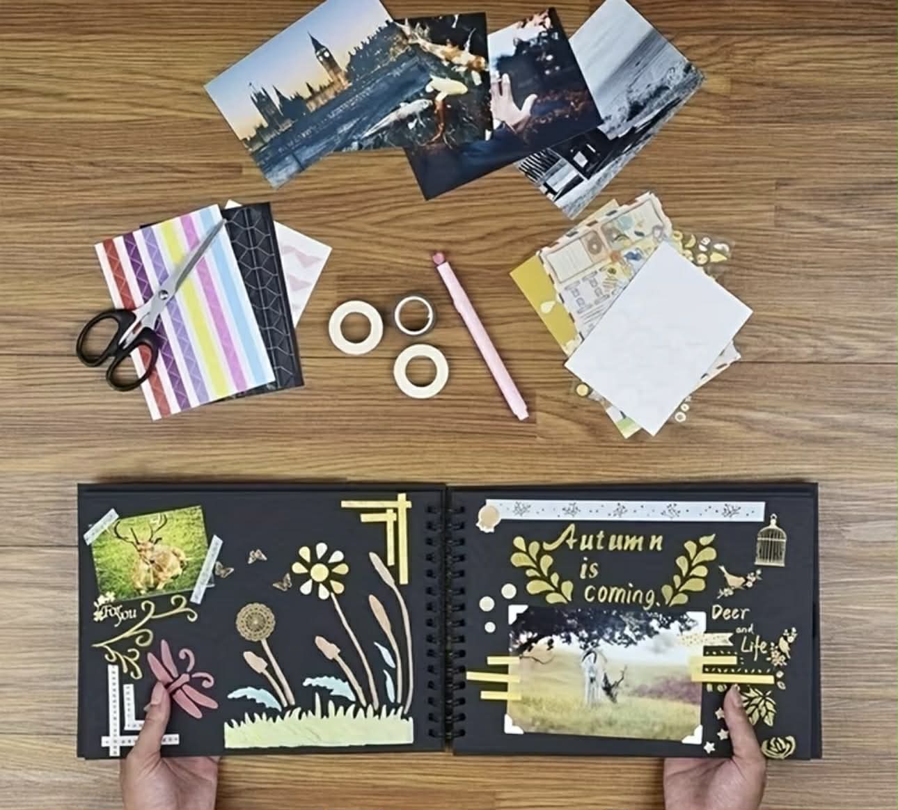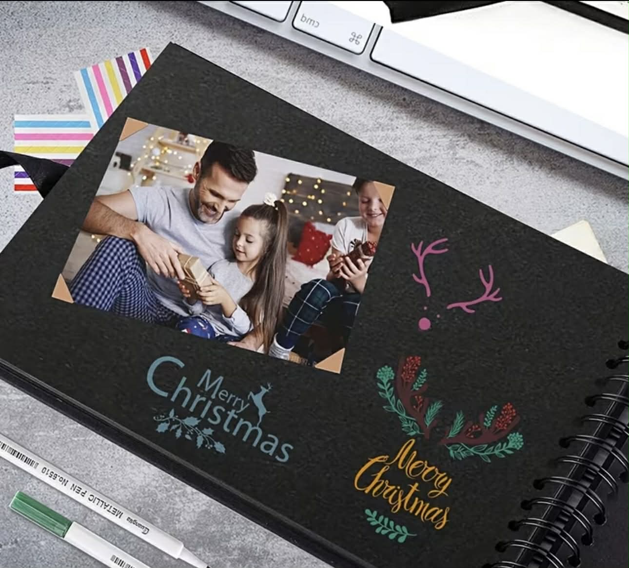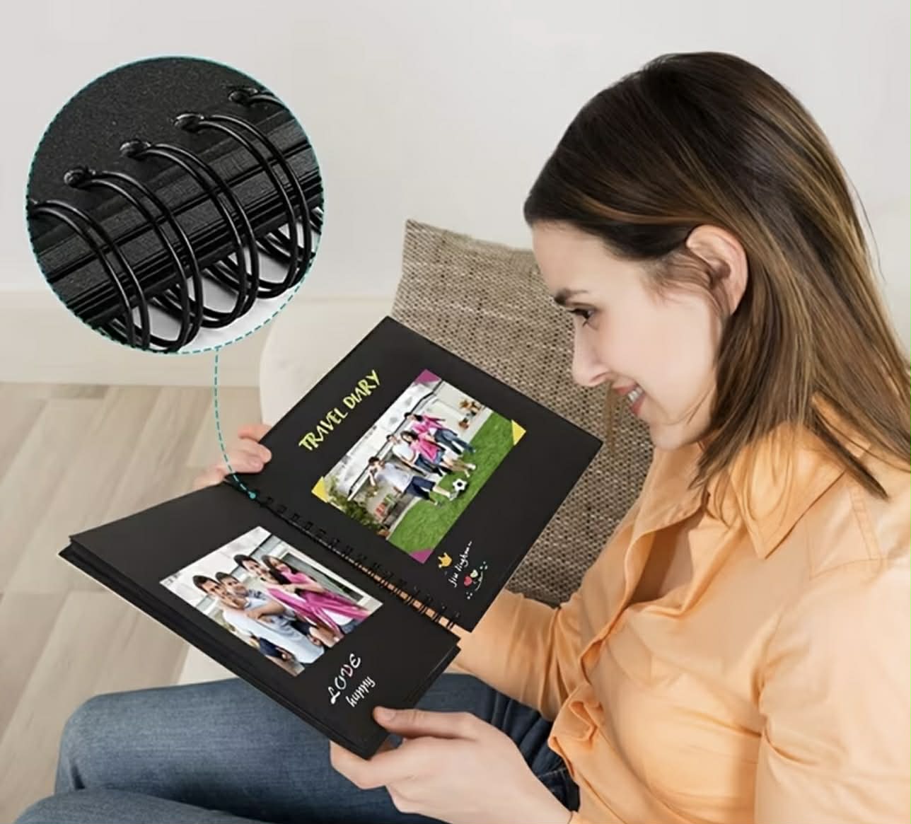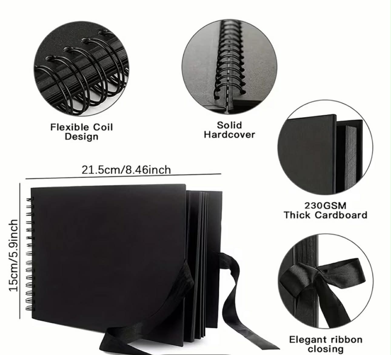 Størrelse: 20,5 x 20,5 cm Album har 30 sider, har hjørner beskyttelse, dobbelt spiral binding og stylish strap. Kan brukes også som fotoalbum.